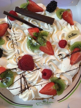 Heerlijke slagroomtaart met cake, verse vruchten, bitterkoekjes, slagroom. Taart wordt royaal afgewerkt met slagroom, vers fruit. Extra opties tekst of foto.